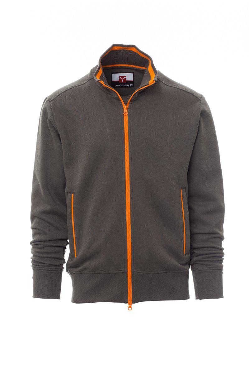 Felpa da uomo, zip intera SBS in plastica in colore a contrasto, con doppio cursore in metallo. Colletto in rib con profilo a contrasto anche alle tasche laterali, manica a giro, due tasche esterne con zip a contrasto, polsini e vita in costina elasticizzata. Cuciture rinforzate. Composizione: GARZATO 70% COTONE + 30% POLIESTERE. Peso: 300 GR/MQ.
